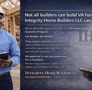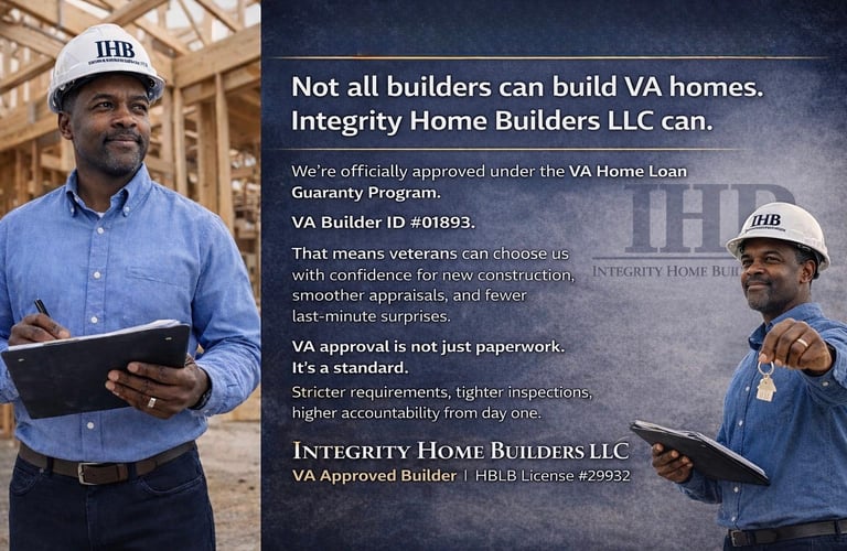 Integrity Home Builders LLC is experienced in VA construction loan builds and understands VA Minimum Property Requirements, inspection standards, and structured draw schedules.